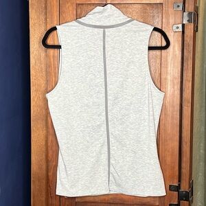 Pre-loved Athleta Industry tank top in grey heather. This sleeveless athleisure top features a modern mock-neck silhouette with a smooth, flattering fit and clean vertical mesh seam detailing on the back. Lightweight and breathable with a soft hand feel, making it perfect for workouts, yoga, travel, or casual everyday wear. Easy to dress up or down for an effortless active-to-street look.