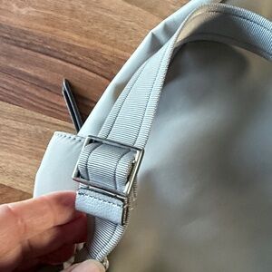 This is a Kate Spade nylon backpack in pristine condition. It is a light gray color. It has two water bottle pockets on the side, a front zip pocket, 2 inside pockets, one padded for a laptop or iPad, adjustable straps on the back plus a handle. Approximate 12x13”.