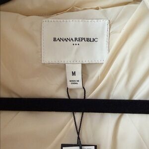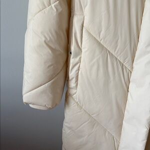 Elegant off-white puffer jacket. Features a cozy hood and sleek design. Ideal for cold weather.