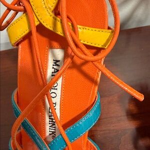 Vibrant heels with strappy design. Features orange, blue, and yellow accents. Perfect for a bold look.