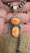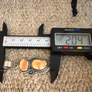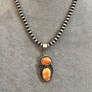 For your consideration is this incredible handcrafted Navajo-style pendant made from brushed sterling silver, marked "sterling." The pendant features two oval cabochon stones of Sea Sediment Jasper with a peachy-orange and cream-colored base and reddish-brown copper veining. The stones are set in a bezel with a twisted rope design around the edges. The silverwork includes intricate details, such as a small flower and leaf-like embellishments on the side, giving it a Southwestern aesthetic. The pendant has a large 10.1mm bail at the top, allowing it to be worn with various styles of chains and pearls.