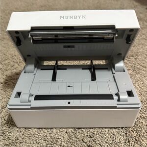 Munbyn Bluetooth Thermal Label Printer. Comes with cord, brand new 2.25”x1.25” 1000 ct. labels, as well as roll that’s about half used.