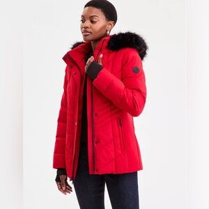 Stylish red puffer jacket by Michael Kors. Features elegant black fur trim. Perfect for cold weather.