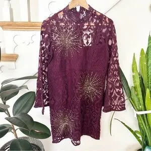 Free People lace mini dress in a rich plum / burgundy shade, featuring intricate beaded starburst embellishments throughout. Designed with a high neckline, sheer lace overlay, and dramatic bell sleeves for a bold, boho-glam silhouette.
