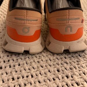 Sleek On Running shoes. Perfect for performance. Color is peach, orange, and black. Size 6