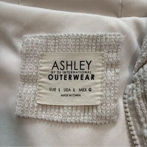 Elegant cream outerwear by Ashley. Features a cozy design.
