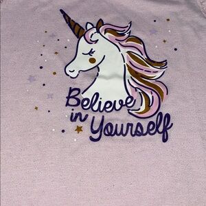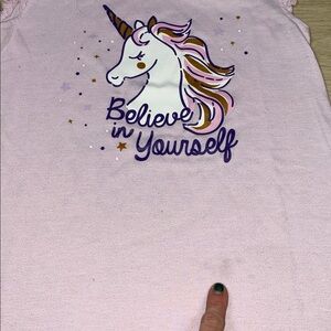 Adorable pink tank top with unicorn design. Features 'Believe in Yourself' message. Perfect for little unicorn lovers.