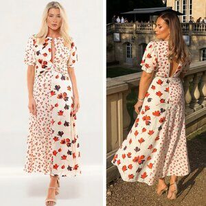 This NWOT Self-Portrait Mixed Floral Print Midi Dress blends cottagecore romance with modern refinement. The cream base and multicolor floral panels create a softly structured silhouette, while front and back keyhole details, and an A-line skirt lend a touch of vintage charm. Lightweight viscose fabric makes it comfortable for spring and summer occasions—from garden weddings to brunches and outdoor soirées.