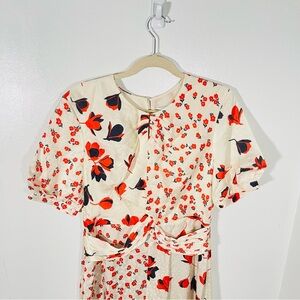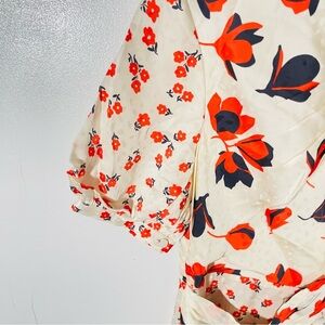 Color & Detail: Cream with mixed floral panels; jewel neckline; puff sleeves; front and back keyhole details with button closure; flared A-line midi skirt.