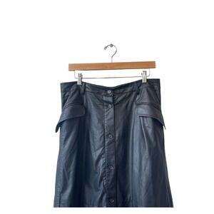 Keywords: faux leather, midi skirt, button front, cargo pockets, black skirt, edgy, modern, streetwear, night out, daytime, versatile