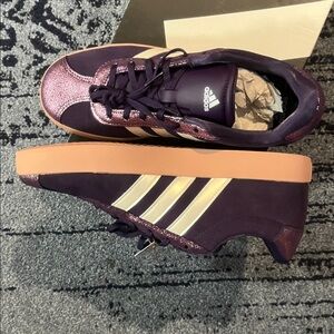 Stylish Adidas sneakers with a bold purple and glitter design. Ideal for casual wear and making a statement.