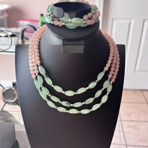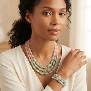 Elevate any simple top with this pastel beaded jewelry set featuring a multi-strand necklace and a matching stretch bracelet. The mix of soft blush pink and mint green beads with silver-tone spacer accents gives a polished, feminine look that works for everyday wear or dressed-up occasions.