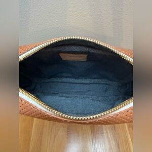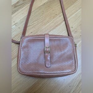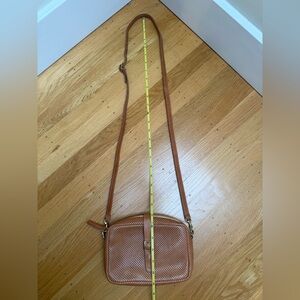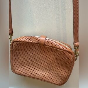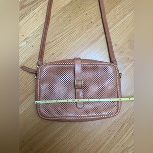 Stylish and versatile, this perforated tan leather crossbody bag is perfect for any occasion. Its sleek design and adjustable strap offer both comfort and elegance. Clean inside and out. Lighting in photos make it seem like there are marks on external portion of bag, but there are none. Approximate measurements: