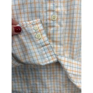 Peter Millar button down shirt in men's size large. This long sleeve shirt features a classic plaid pattern in orange and blue hues. It is a button-front style with a collared neckline and a single chest pocket. The cuffs have button closures.