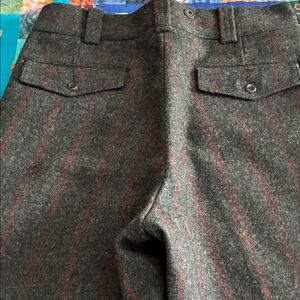 Heavy 85% percent wool pants by Woolrich. These are vintage and have an approx. 34” waist and 30” length. I believe they were men’s but they fit a gal like me (just shy of 64” inches tall and weight 139 pounds). They are in great shape and from a pet and smoke free home. No perfume scent. I bought these years ago and just never wore them.
