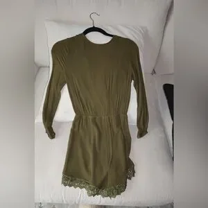 Olive green romper with lace details. Loose fitting. Can be dressed up or down