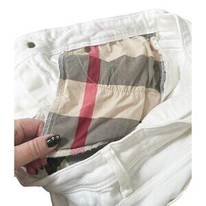 Burberry Brit Westbourne Skinny Crop pants in white. Pants have a bronze-colored metal loop on front pocket, nova check inside pockets, and back patch with Burberry logo. Pants are made of a lyocell, cotton spandex blend and are a woman's size 29.
