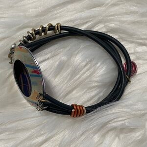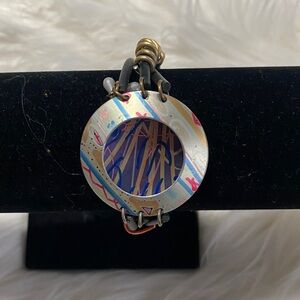 This unique bracelet features an artistic multicolor pendant, perfect for adding a touch of creativity to any outfit. The design includes shades of blue, gold, and black, making it a versatile accessory for any occasion.