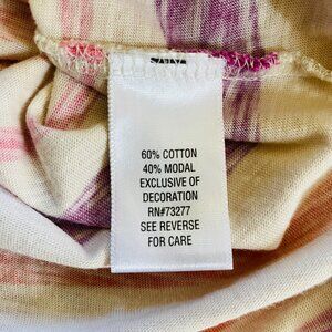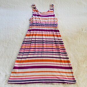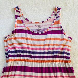 This Sonoma striped dress is a great casual, everyday piece for summer. The colors consist of a tan background with pink, purple, raspberry and orange stripes. The elastic waist makes it comfortable and flatters the figure. Perfect with flip flops at the beach or at a picnic or add wedges or espadrilles for a dressier look.