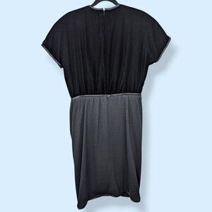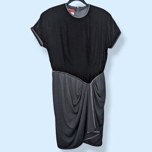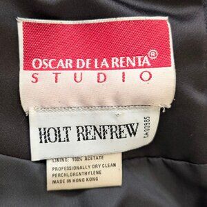 This vintage dress by Oscar de la Renta Studio is made of several different materials that break down as follows: body (acetate/rayon - 65/35), skirt (acrylic/wool - 80/20), lining (100% acetate). While the body (top) is a dark velvet, the skirt is softer and has more movement. The dress has short sleeves, shoulder pads (that could be removed if you really want), and a defined waist with a front gathering of the skirt. There is a long zipper in the back with a hook and eye closure at the top. There is also an inner belt/sturdy fabric strip that has 2 hook and eye closures, presumably to help prevent the zipper from pulling. The lining had a vertical tear in the front but has a patch affixed to the back of the tear on either side (see pic 7). The dress has normal wear and though it is repaired, the tear in the lining is the most obvious issue that might affect wearability for you, though it isn't visible when the dress is worn. The hem of the dress falls around the knees.