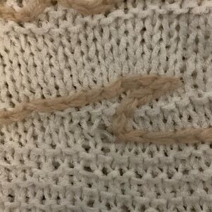 Cozy cream sweater with stylish beige script. Overall condition is good, no pilling but there are some areas where the knit is not as tight as it once was. See pics at the end of reel. No stains, cute over shorts walking on the beach when cool.