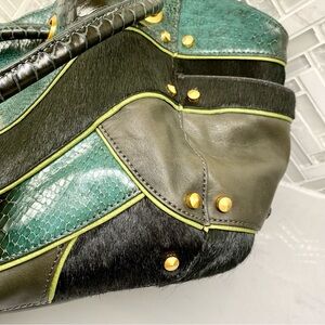 Cole Haan Large Exquisite Gold Fish Handbag features reptile print, calf hair, leather patchwork. Gorgeous tones of green and gold tone hardware. Side pockets for easy access, along with additional interior pockets.