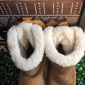 Charming Hot Tomato boots. Tan suede with cozy cream trim.