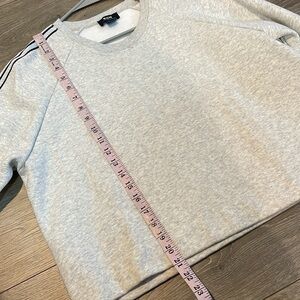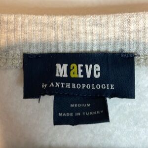 Anthropologie Maeve Sporty Stripe Crew-Neck Sweatshirt. Stylish cream sweatshirt featuring navy stripes with silver shimmer on the sleeves. Perfect for casual, sporty, travel, lounge wear. Like new condition, crew neckline, long sleeves. Cotton / polyester material