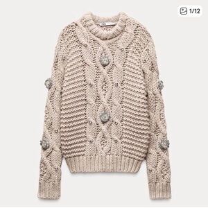 Stay cozy and stylish with this elegant beige knit sweater. Featuring intricate embellishments, it's perfect for any occasion. Worn once. Sold out!