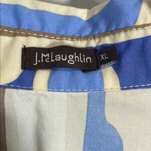 This stylish midi dress by J. McLaughlin showcases a notched collar and puff short sleeves, ideal for casual or resort settings. The blue and cream hues complement its belted waist, offering a flattering and relaxed fit. Its flowing fabric and classic design make it a versatile addition to any wardrobe.