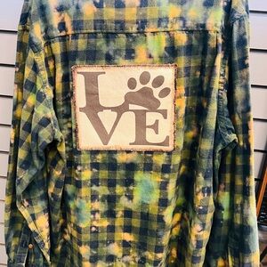 This stylish bleached plaid flannel button down shirt features a unique 'Love' patch on the back. Perfect for casual outings, it combines comfort with a trendy design. The shirt's green and blue hues make it a versatile addition to any wardrobe.