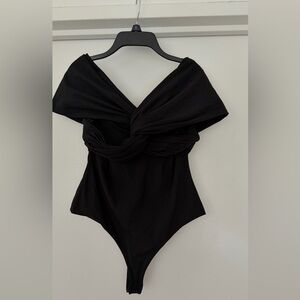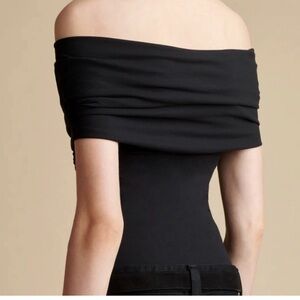 Luxurious black bodysuit with elegant draping. Features KHAITE label.