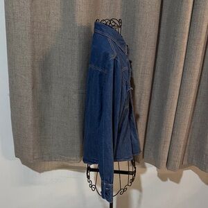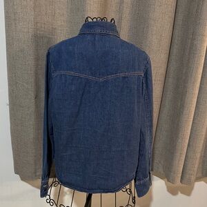 Classic vintage blue jean shirt. Features button-up front and chest pockets. Retro orange stitching for a coastal cowgirl vibe. No size/material tag, but has size medium dimensions. Excellent vintage condition.