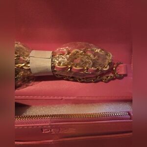 Bebe Sophia small quilted crossbody bag in a bright "bubblegum" or "fuchsia" pink color with gold-tone hardware. Gold chain with the pink leather woven thru. Vegan leather with a chevron quilted pattern.