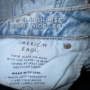 American Eagle super high rise baggy wide leg jeans in a light wash denim. Trendy relaxed fit with a flattering super high rise waist. “Short” length is perfect for petite or shorter inseams. Made with at least 10% recycled fibers.