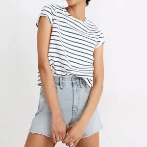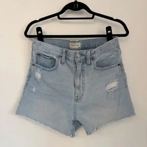 These superhigh-rise shorts are fitted through the waist with an easy A-line shape. With artful rips and a frayed hem, they really nail that comfy-meets-cute thing. High rise, easy fit through hip and leg. 100% cotton denim. Machine wash.