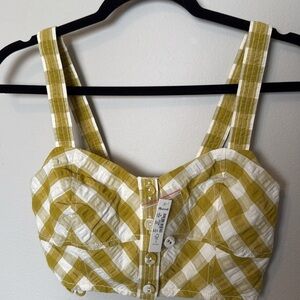 This is a NWT classic Madewell Crop Top that is a white and yellow checkard styled look with buttons down the middle and a stretch back. Made in India. Additional buttons still attached. Size 00