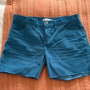 Teal jean shorts by Carve Designs. Features frayed hem and classic style. Ideal for casual wear.