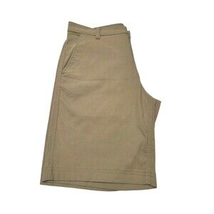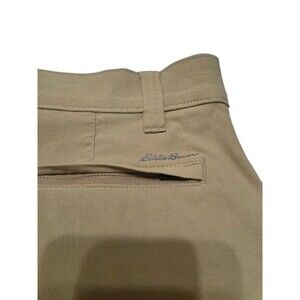 The Eddie Bauer Travex Shorts in khaki with a 10" inseam are designed for men in size 34. These mid-rise chino shorts feature stretch pockets, perfect for hiking and other outdoor activities. Made from a durable microfiber fabric blend of nylon and spandex, these shorts are easy to care for and machine washable. The solid khaki color and flat front give these shorts a classic and versatile look, suitable for casual outings, travel, or workwear. Ideal for all seasons, these shorts are a must-have for those who enjoy the outdoors.