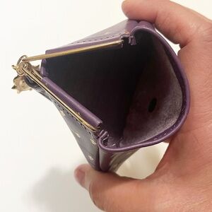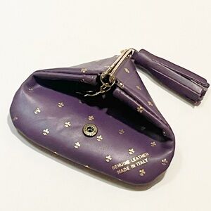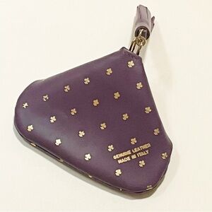 Beautiful Florentine (Firenze) genuine leather coin purse in a soft purple tone with delicate gold clover-style accents. Made in Italy and crafted in the traditional Florentine leather style commonly found in Florence leather shops and markets. Features a structured framed closure and decorative gold charm. Perfect for coins, small jewelry, or tiny essentials.