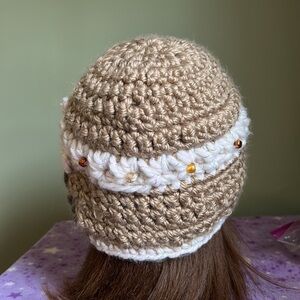 Embrace warmth and style with this elegant crochet beanie. Featuring a charming floral design in golden satin and white, it's the perfect accessory for any outfit. Warmest winter hat clean never worn new wash suggestion in tied pantyhose sock or cloth laundry bag to prevent piling fuzz and maintain form and beauty.