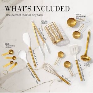 15-piece white and gold cooking utensils set, complete with everything from gold ladle, tongs, serving spoon, slotted turner, gold whisk, spatula, to a set of gold measuring cups and spoons.