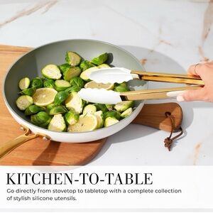 Our non-scratch, BPA-free, silicone white and gold utensils are tough on tasks but gentle on your non-stick cookware. Resistant to extreme temperatures, these gold and white kitchen utensils come with a matching gold utensil holder that not only organizes but elevates your countertop.