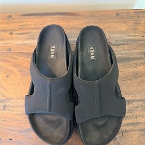 Comfortable platform style slides. Fits snug so they don’t slip off. Have good arch support. In excellent condition. I wear 8.5 and these fit perfect.
