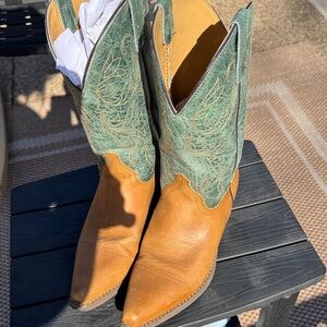 Stylish green and buckskin heeled boots perfect for any occasion. These boots offer a unique blend of colors and a comfortable fit. These boots are heavy duty and if I was going to keep them I would wear them to the barn. Good sturdy boot!