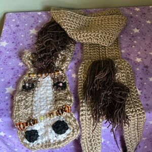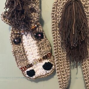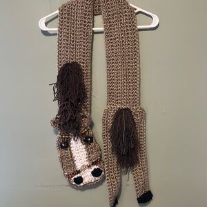 Stay warm and stylish with this charming brown horse medium long to rap around neck knit scarf. Perfect for adding a playful touch to your outfit. Warmest winter scarf clean never worn new wash suggestion in tied pantyhose sock or cloth laundry bag to prevent piling fuzz and maintain form and beauty.