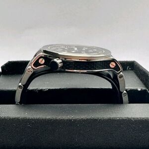 The SE Extreme 200's sandwich construction case is actually made of Stainless steel and layers of black polyurethane. It features a fixed top-bezel with a dot-motif and an exhibition caseback. The dial has a black raised honeycomb texture, a rotating minute reflector, a silver-toned signature dot, luminescent hands and raised hour markers, white accents and date display at 6 o'clock.