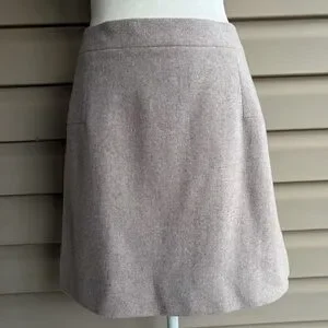 This is a classic, fully lined wool blend skirt from J. Crew Factory, ladies size 12. The fabric, 70% wool/30% viscose, is a neutral oatmeal tan color. Features a slight A-line silhouette, unique seaming work, and a hidden zipper closure in the back. Comfortable yet polished, this skirt will be your go-to for work, dinner, and everything in between!