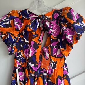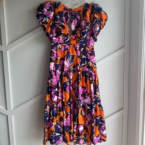 By Anthropologie Puff Sleeve Midi Floral Orange and Purple Dress size S