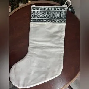 Add a touch of elegance to your holiday decor with this beautifully designed cream and green Christmas stocking from Hearth and Hand by Joanna Gaines from Target. Perfect for hanging by the fireplace or on your mantel. Approximately 8” wide at the top and 18” long